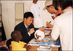 지난 6월 15일 본 위원회는 월드컵 1주년을 기념하며 상암 월드컵 경기장 북측 광장에서 자선 행사를 진행하였습니다. ’지구촌 어린이에게 꿈을…’이라는 주제로 진행된 이번 행사는 본 위원회의 홍보 대사로 활동 중인 국가 대표 축구 선수 이운재 선수와 그가 이번에 초청한 카메룬의 후원 아동 브레스코를 소개하며 시작됐습니다.