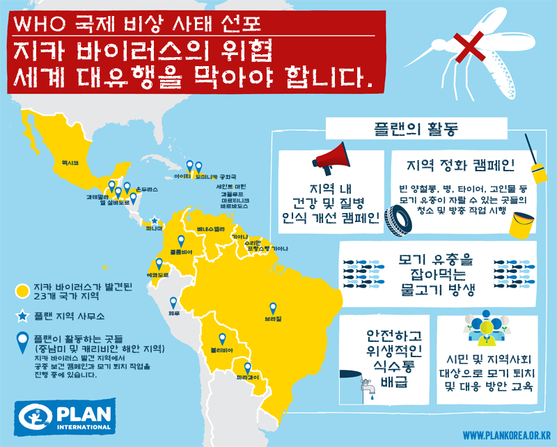 “지카 바이러스는 분명하고, 실재하는 위협입니다. 지카 바이러스에 대항해 싸우는 것은 시간을 다투는 일입니다. 긴급하게 대비 및 대응 활동을 조직해야 하고 이 바이러스가 전염병 수준으로 번지지 않을 수 있도록 막아야 합니다.” 플랜 인터내셔널의 재난 대비 및 대응 부서의 수장인 어니 크리슈난 박사는 말했다.